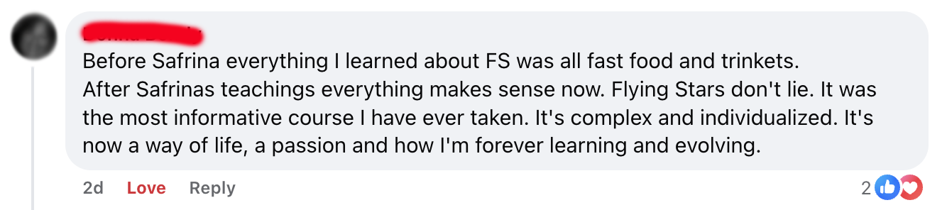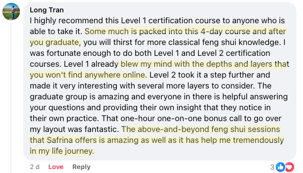 " After completing the annual Fengshui class and witnessing positive results, I decided to enroll in the Flying Star Certification Program. This intensive four-day course was invaluable in helping me understand fundamental knowledge in this realm and how energy flows through both living and work spaces. Upon obtaining the certification, I immediately assisted my struggling father and brother in their businesses.