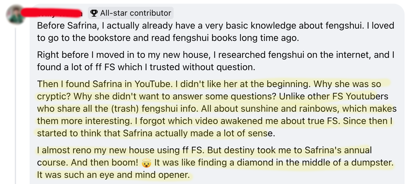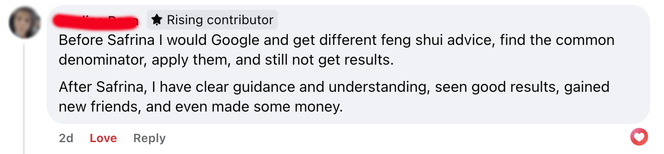 I was in a unique position before taking Safrina’s course. I knew with surgical precision that real Feng Shui worked and was a legitimate ‘science’. I had previously invited a Master to come to my home and conduct a comprehensive analysis to help my family deal with some significant challenges (both financial and health related). Some of the changes he recommended seemed extreme. Chopping down trees, placing certain crystals in particular rooms, moving furniture, etc. We had some skepticism. I tested, observed, and verified. I was awestruck by the changes.